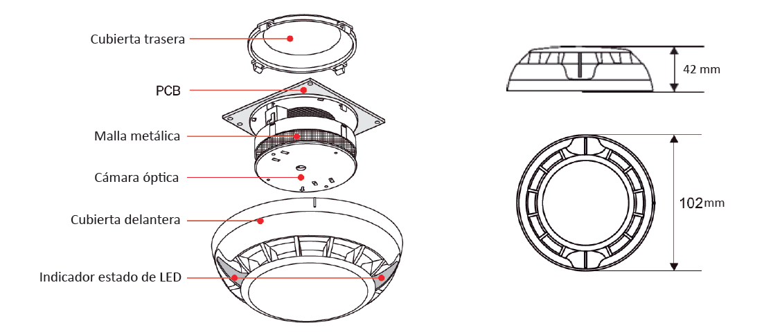 El detector está diseñado para detectar el humo en la etapa muy temprana de la situación de incendio.