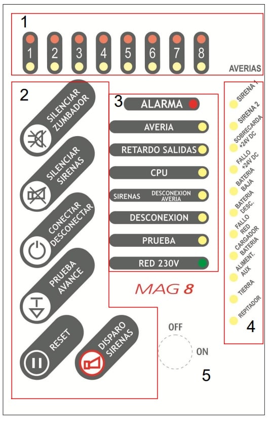 Dispone de selección de zona de pulsadores o zona de detectores, retardo de las salidas y conexión al módulo de relés AE/C5-R8.