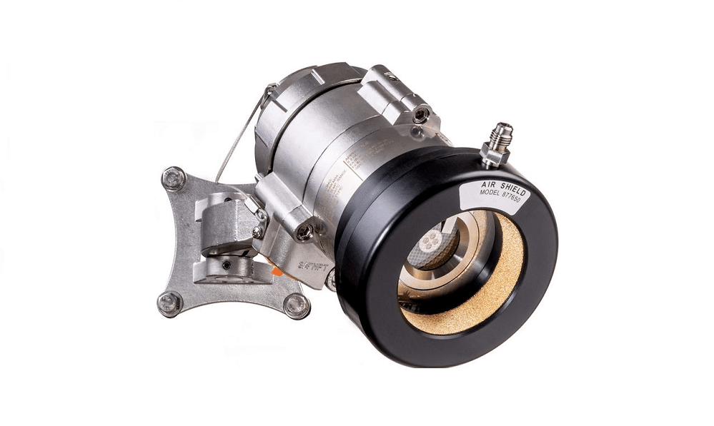 Air Shield permite la conexión de una línea de aire comprimido para proporcionar una “cortina de aire” que ayuda a evitar la acumulación de suciedad en la ventana del detector, reduciendo así la necesidad y la frecuencia de mantenimiento en entornos contaminados o sucios.