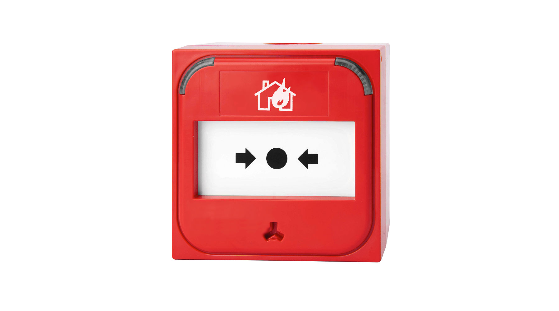 Pulsador manual de alarma direccionable de acción simple de color rojo para interiores con un indicador funcional de casa en llamas.