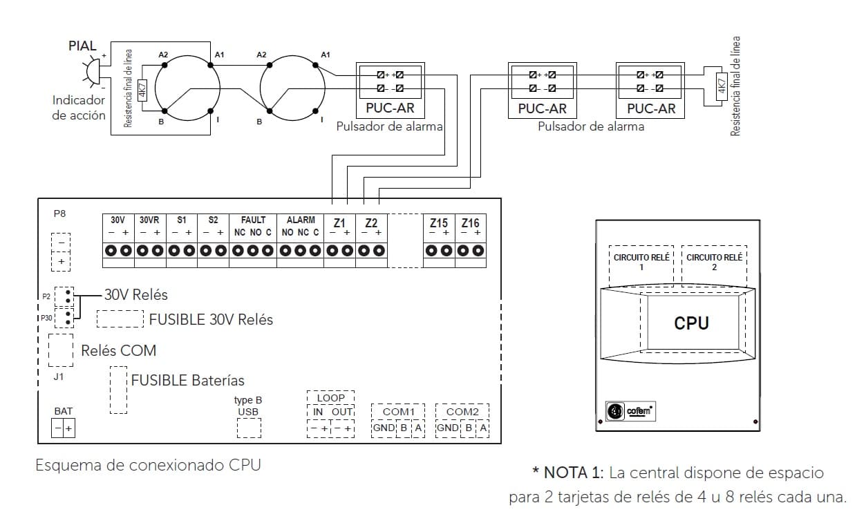 • Capacidad de incluir 4, 8, 12 ó 16 salidas de relé. Estos relés pueden estar supervisados (salida contacto húmedo) o sin supervisar (salida contacto seco NA/NC).
