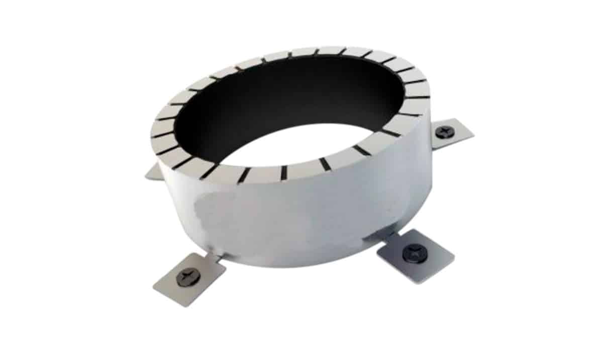 Collarín circular de acero inoxidable que aloja en su interior material intumescente.