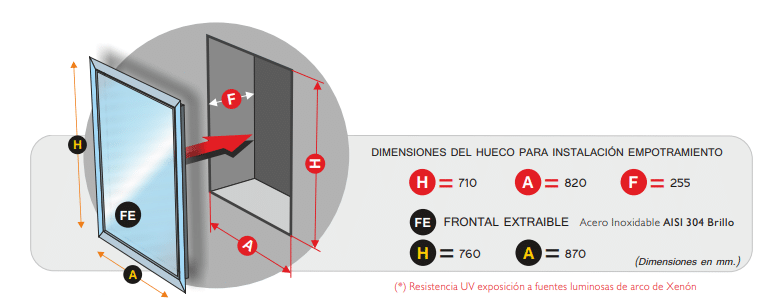 Dimensiones del frontal extraíble Altura= 760, Ancho= 870 mm.