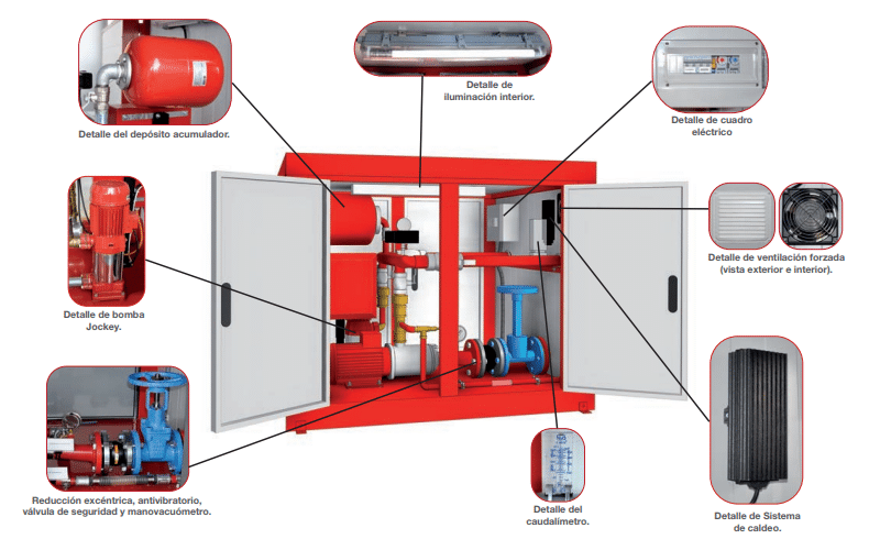 El equipo FIRE BOX ofrece un diseño muy compacto compuesto por una estructura modular fabricada en panel de chapa tipo sándwich (habitáculo resistente al fuego durante 60 min. EI60 de acuerdo a normativa 23500) y en cuyo interior se aloja el equipo de bombeo y, por tanto, es muy adecuado para instalarse en todas aquellas ubicaciones donde el principal requisito sea el mínimo espacio.