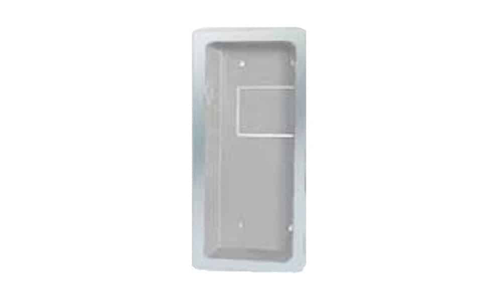 Armario Construido en acero DC04 de 1 mm de espesor, con 4 taladros para sujeción a pared y troquelado posterior para fijación del extintor a la pared.