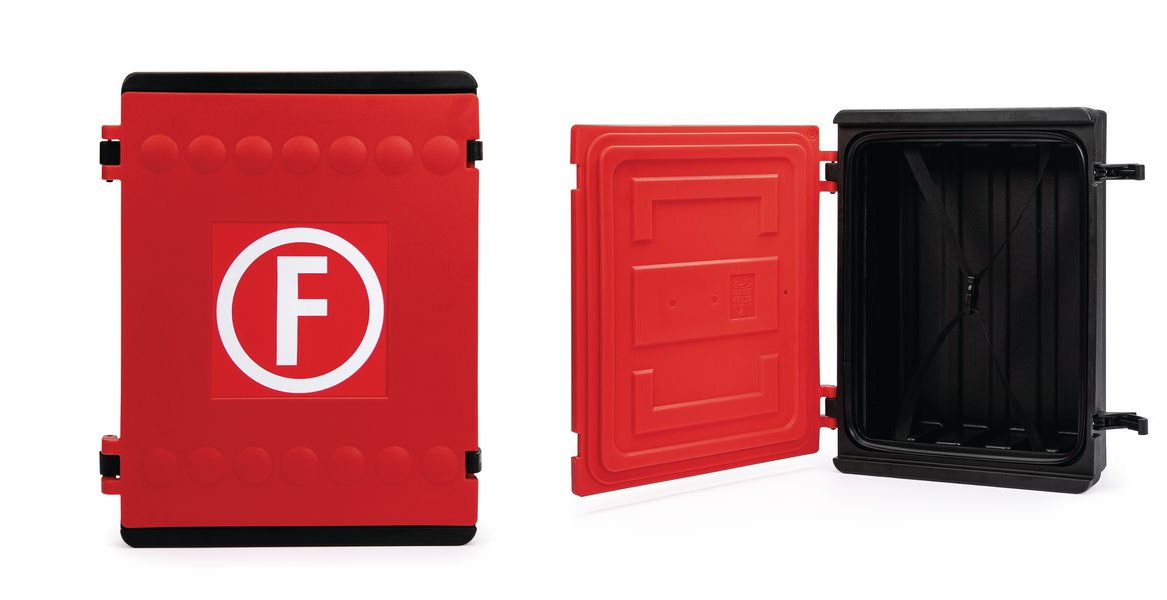 Armario en polietileno para Almacen de manguera y lanza con correa para asegurar el contenido y cierre resistente al agua.