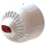 Sirena de alarma de policarbonato a 24Vcc / 5.1-41mA para interior con montaje en techo, color blanco, con lámpara lanzadestellos de color rojo. 32 tonos.