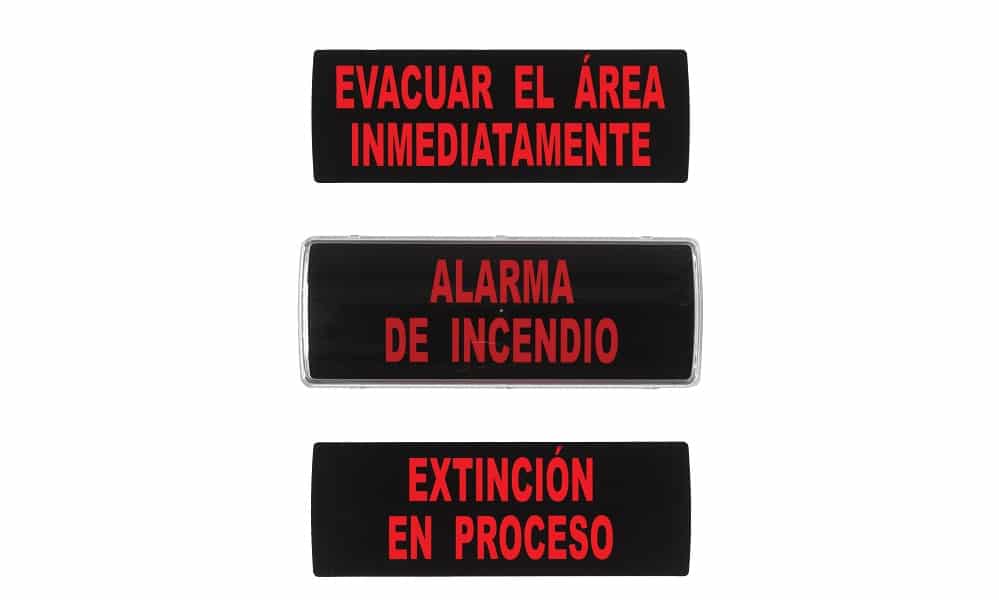 La unidad se suministra con 3 tipos de mensajes insertables: Alarma de Incendio, Evacuar el Área Inmediatamente y Extinción en Proceso.