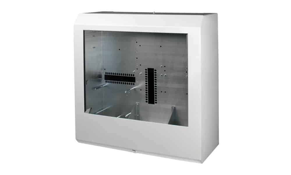 Carcasa B2 para sistema F1, corte para panel de control con LED (96 Leds) de grupo de alarma, capacidad para máx. 12 bucles / 48 Zonas Convencionales, incluida cerradura sin electrónica incorporada preparada para alojar una extensión básica “Solución F1”