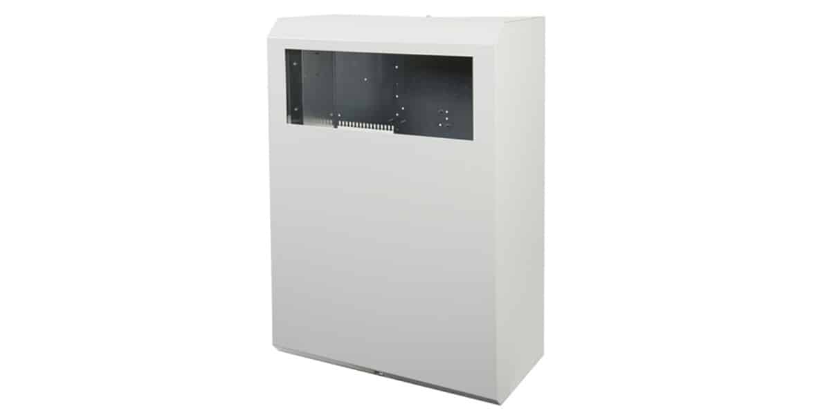 Carcasa C1 para sistema F1, corte para panel de control sin LED de grupo de alarma, capacidad para máx. 18 bucles / 72 Zonas Convencionales, incluida cerradura sin electrónica incorporada preparada para alojar una extensión básica “Solución F1-18”