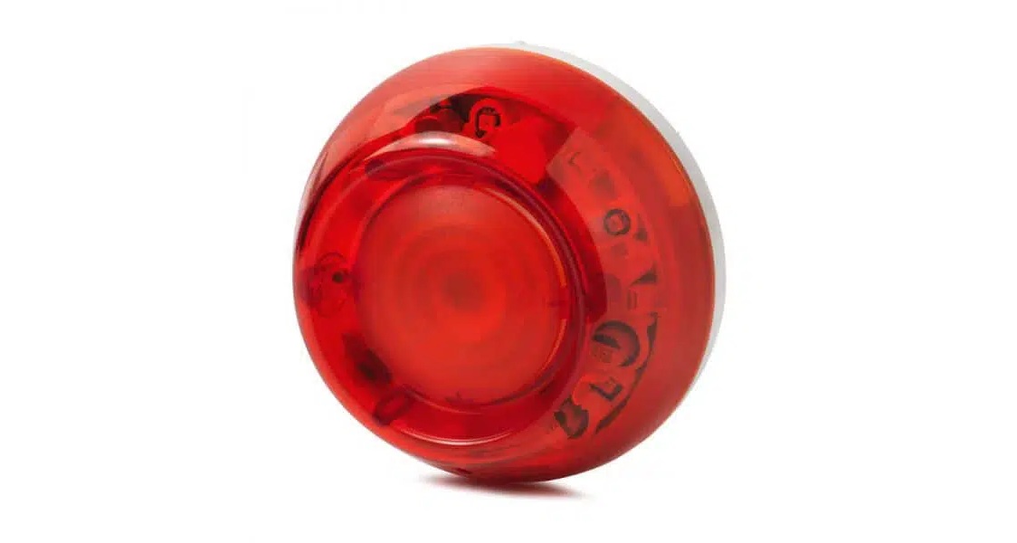 Sirena óptico acústica de alarma en color rojo con 11 tipos de tono seleccionables, 2 niveles de activación programables.